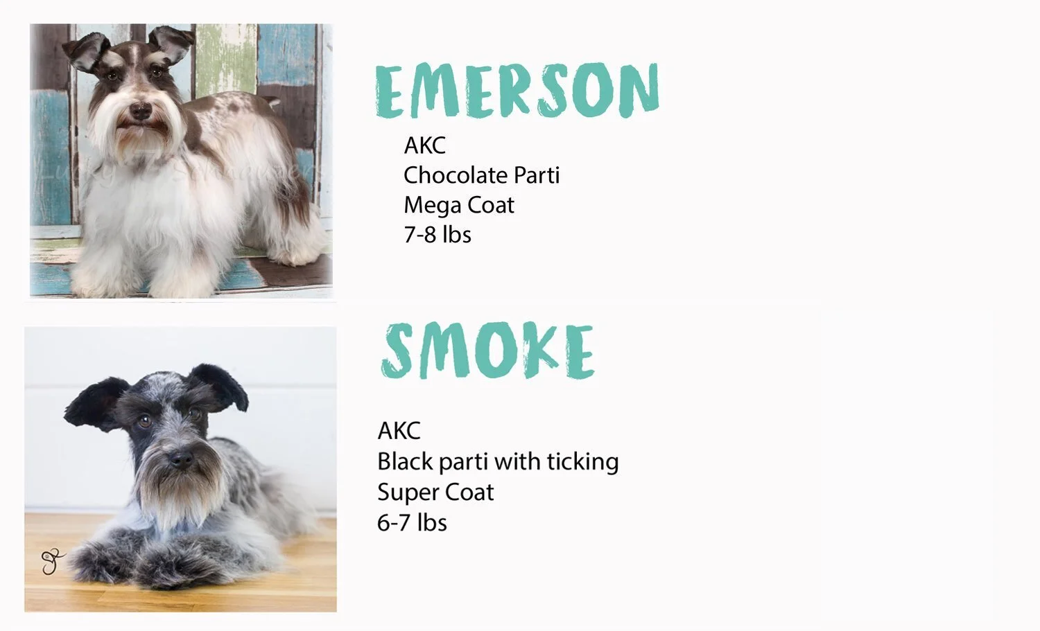 All our schnauzers come with: a 5 year health guarantee, AKC Papers, Microchip, crate, collar, leash, brush, toy, blanket, puppy food, AKC Puppy Protection Package ($200 value), and lots of love! We also take care of the hassle of registering your puppy to you as well as their microchip.