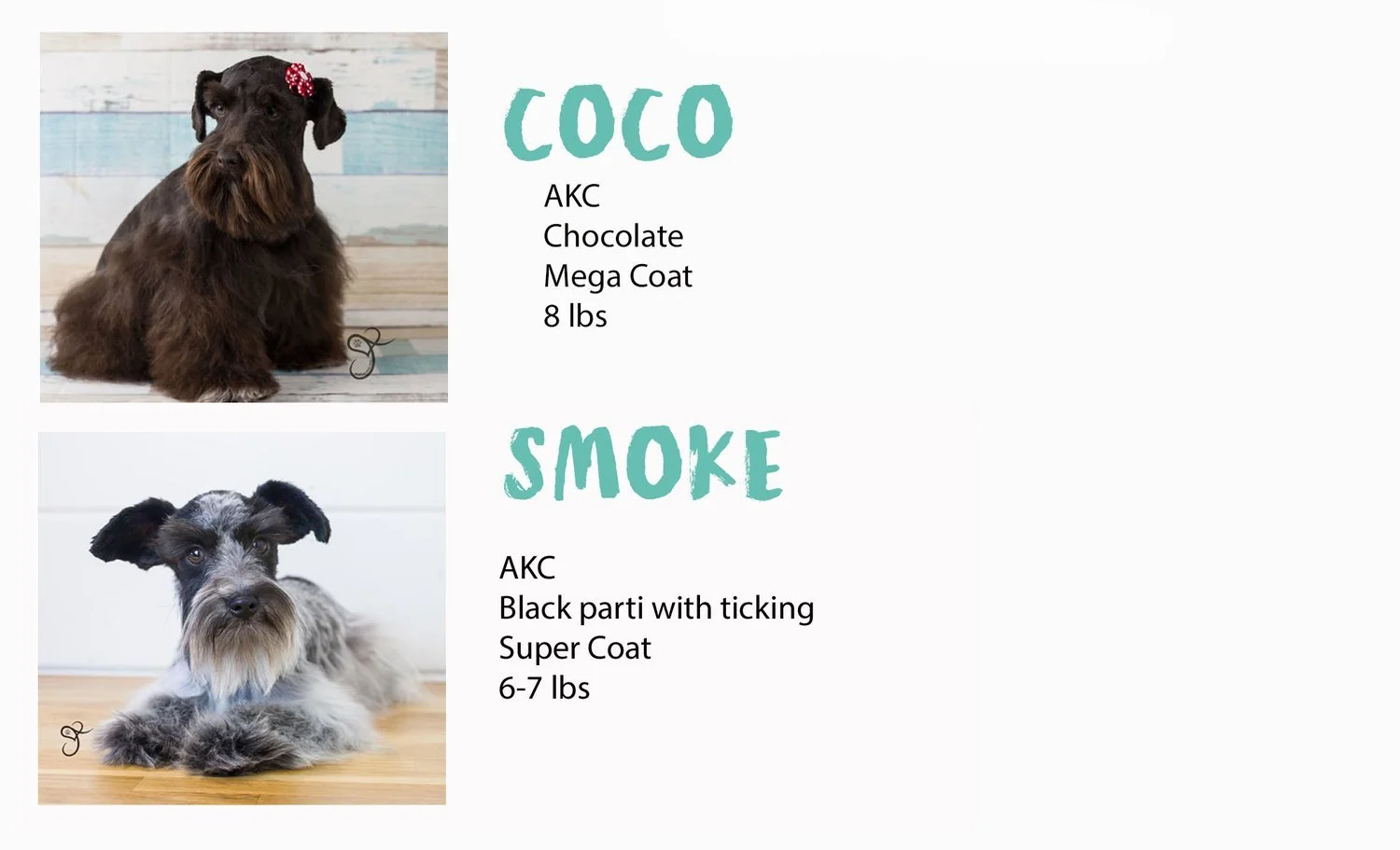 All our schnauzers come with: a 5 year health guarantee, AKC Papers, Microchip, crate, collar, leash, brush, toy, blanket, puppy food, AKC Puppy Protection Package ($200 value), and lots of love! We also take care of the hassle of registering your puppy to you as well as their microchip.